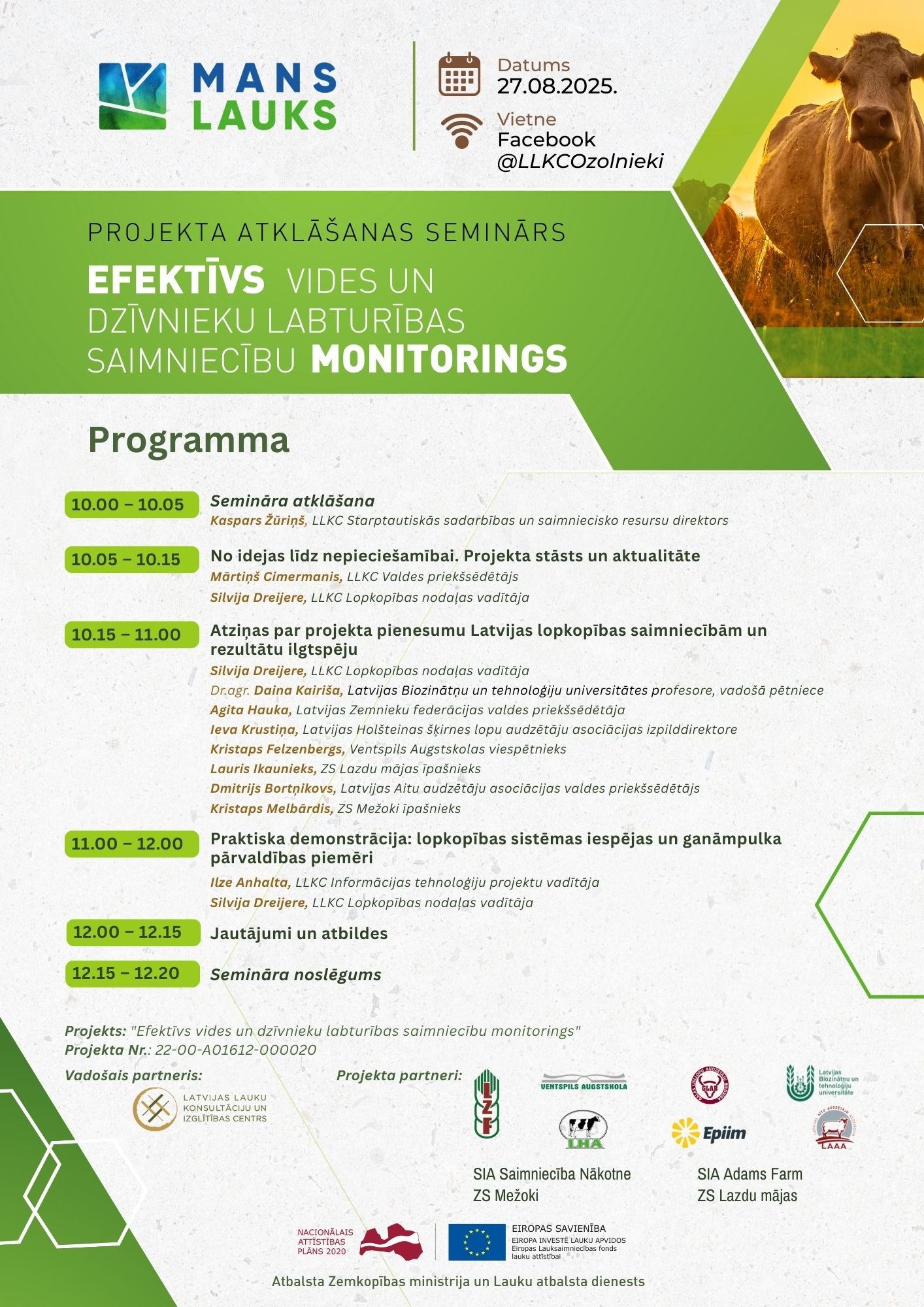 Semināra laikā dalībnieki iepazīsies ar projekta idejas rašanos un uzzinās, kāpēc tā ir īpaši aktuāla tieši šobrīd. Tiks uzklausītas ekspertu atziņas par ieguvumiem Latvijas lopkopības saimniecībām un projekta ilgtspēju, kā arī demonstrēta jaunās lopkopības sadaļas funkcionalitāte ar praktiskiem piemēriem, kā šo rīku ieviest savā saimniecībā jau šodien. Noslēgumā būs iespēja saņemt atbildes uz sev interesējošiem jautājumiem.